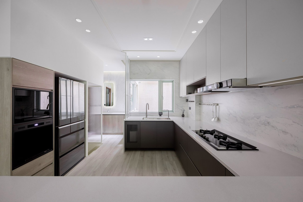 考量餐廚需求,中段牆面選用抗菌、易清潔、耐燃的愛克板。