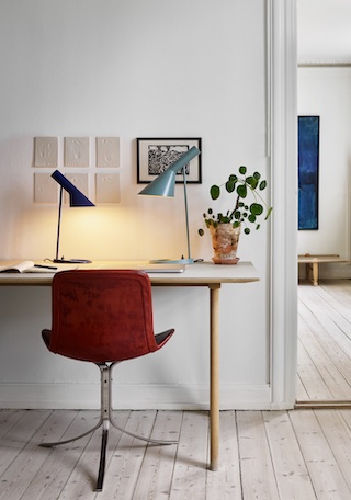 「Louis Poulsen」AJ桌燈 / 立燈是設計師Arne Jacobsen於1957年為哥本哈根的SAS Royal Hotel所設計。AJ系列的特色在於其燈頭部分不對稱式的設計風格,燈罩部分可上下調整投射角度;燈座之處鏤空的圓孔,原先設計是留給煙灰缸的置放,獨到的設計巧思與美感,讓其雋永且不退流行。(居雅堂 JYT Design)