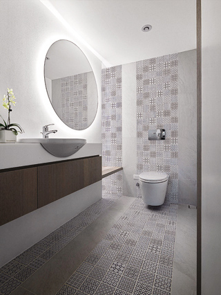 考量客廁空間有限,黃國峰選用TOTO半崁式臉盆,滿足空間寬度限制,方便門片開啟。同時,為喜歡書法的業主,選用青花瓷風格磁磚,從地坪延伸至牆面,透過線條創造視覺集中的效果,讓空間充滿雅緻細節,舒心放鬆而不覺侷促。