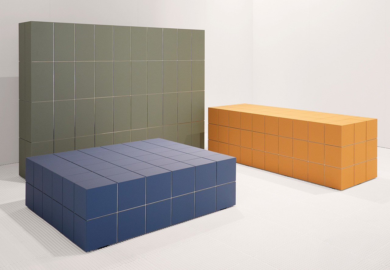 1-2 many是形式與裝飾的材質實驗。三個量體分別由FENIX®0791埃武拉黃、0771納克索斯藍和0794遠峰綠製成,中間設有金屬接頭,形狀各異、用途多元。雕塑物件的質地透過個體倍增的過程,突顯材料的美感與多功能性。