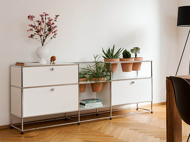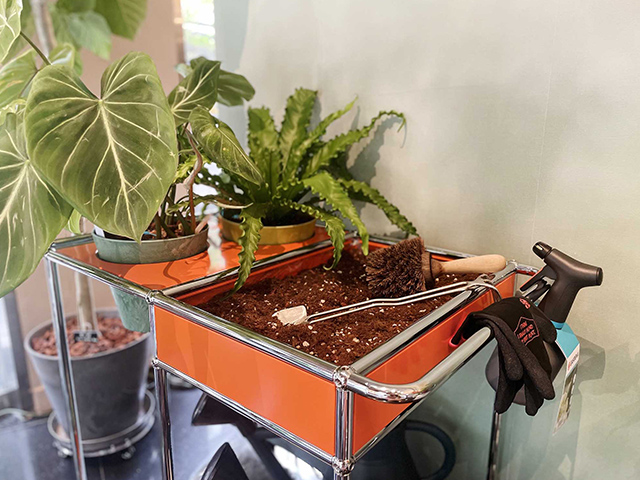 滿足植物愛好者的需求,USM 在層板內側配有調節式 LED 照明,可選擇性為植物提供照明;5種不同尺寸的層板造型,可容納1至4個盆器,錯落的孔洞位置讓植栽配置更加自由。當 USM 層板搭配滾輪,搬動植物不再是苦差事;過去常作為餐車的推車造型,則化身花器推車,方便收納園藝道具、拌土、整理植栽,絕對是花園中最時尚的園藝幫手。