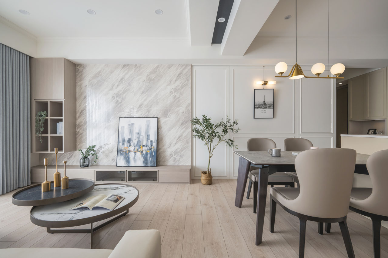 相較於臥室注重隱私、舒適與收納,公領域的客餐廳更強調視覺美觀的需求。「在公共區域使用裝飾板的好處不只是好看,而且真的很耐刮、耐髒、好清潔,有小朋友、養寵物的家庭也不用擔心日常維護」。