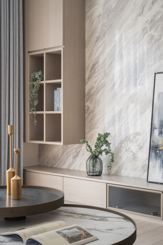 石紋自然擬真的愛克裝飾板,鋪陳低調奢華的電視牆面。