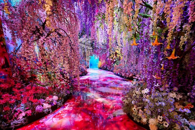 而於京都展備受熱議的《深淵彼岸的夢》,則帶來全然包覆的感官震撼:觀眾先被無盡怒放的絢爛花海擁抱,旋即步入由鏡面與巨型螢幕構築的720度無限全景空間。櫻吹雪、花火、律動海洋,場景永恆變換,使人徹底沉入一個超越現實的彼岸幻夢。