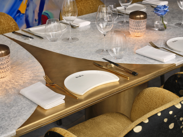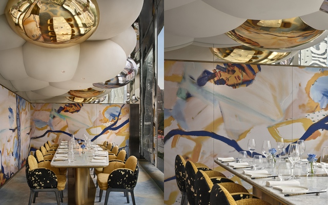 私人包廂則是探索最終樂章的創新藝術與時尚設計。包廂內的塗鴉同樣出自主廚母親之手,為空間注入鮮豔色彩與蓬勃生機,天花板採用棉花糖造型,部分以拋光黃銅的表面點綴其中,成為視覺焦點;而AB Concept設計的泡泡圖案地毯,則捎來幾分俏皮質感。
