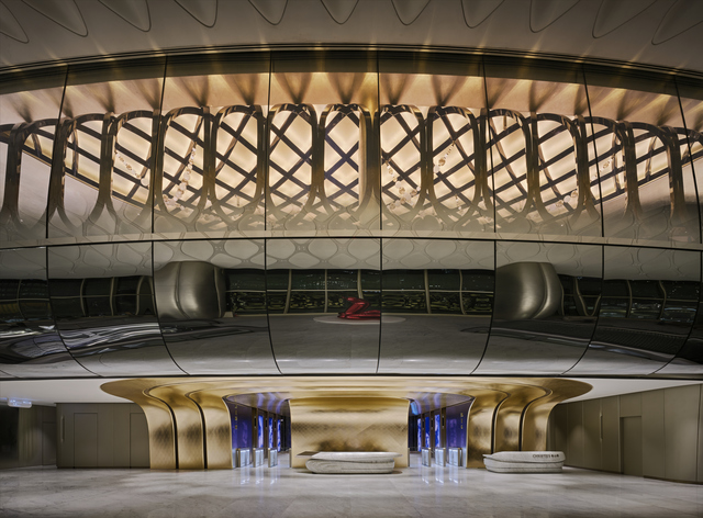 入口以水龍捲為靈感,利用柱狀的旋轉裝置在餐廳入口迎接賓客,和手工打造的金屬牆互相呼應,烘托出Akira Back餐廳螺旋狀的品牌標誌。抬頭仰望,手工上色的天花板與紋理分明的雲石地板連成一線,形成鮮明對比,而豪華的天鵝絨材質則為空間增添暖意。