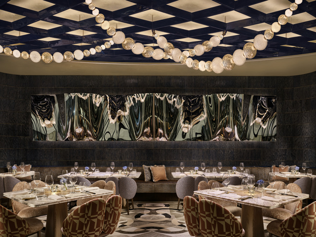 主用餐區是全作的視覺焦點,如同交響曲第三樂章,由慢板過渡至中快板。天花板上的鍍金圍欄富有雕塑感,天花板上的鍍金圍欄的線條富有雕塑感的流線,與The Henderson外牆的有機線條相互映襯,室內外無縫連接。雲石拼花地板為空間創造靈動感,落地玻璃窗引入充沛自然光,令金色裝飾熠熠生輝,猶如陽光灑在水面般波光粼粼。