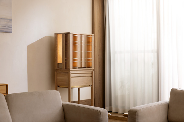 「心居」轉化傳統佛具龐大厚重的意象,從燈具概念出發,透過格柵及材質變化,使燈光自然流淌。櫃體則因應室內空間較常運用的四個色系去做搭配。