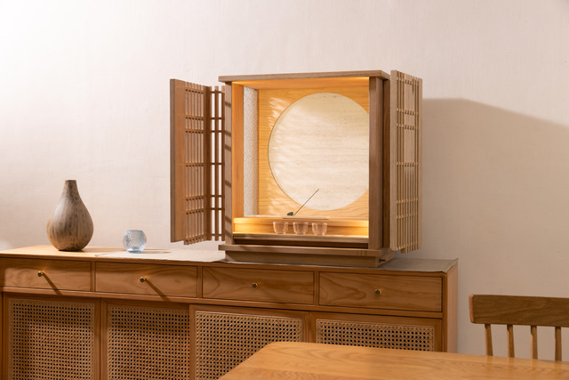 「心居」系列以實木為本,強調溫潤觸感與歲月質地。木紋深沉且自然,每道紋理都是歲月留存的記憶。座體可選擇橡木、紅橡木、橡木染黑、花梨木四種材色,能自然對應大多數住宅風格;背板更是整個系統的一大亮點,它可以根據室內氛圍更換背板,確保器物與空間的融合,讓信仰家具成為住宅風景的一部分。