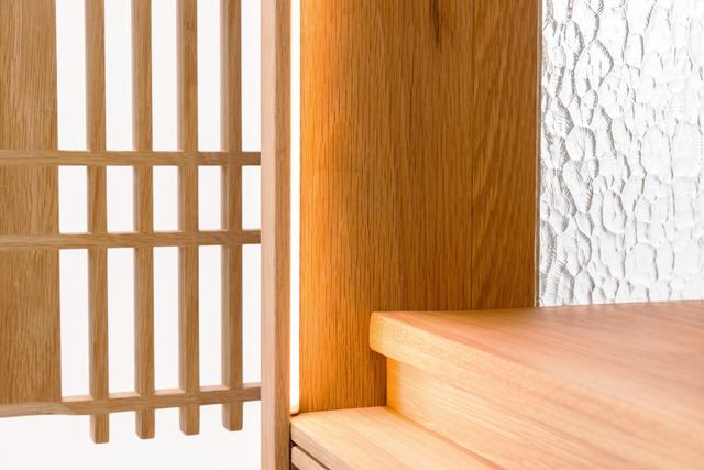 工一設計與義豐靜器製作所決定重新詮釋長明燈概念,櫃體配置LED燈光,在格柵門片以及兩側壓花玻璃的折射下,形成一抹細緻的寧靜。門扉運用了磁吸設計,特殊的開闔機關取代絞鏈,推開時微光從細格柵縫隙中透出,就像是為每日祈願揭開序幕;關上後光仍若隱若現的顯現,輕柔地與日常相伴。