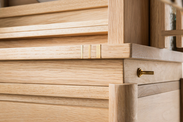 上下分離式的主體結構,則讓祭祀位置能依照家庭格局或方位調整,這種靈活性來自王正行執業多年的經驗。上座可自由擺放於既有平台,底座則包含托盤與抽屜的多層開啟機構,展現新世代佛具的細膩思維;而桌腳亦嘗試精簡化,利用斜面切法讓桌腳從不同角度觀看有不同的粗細變化;全座無螺絲、皆用卡榫的設計,則彰顯義豐靜器製作所高超的工藝技術。