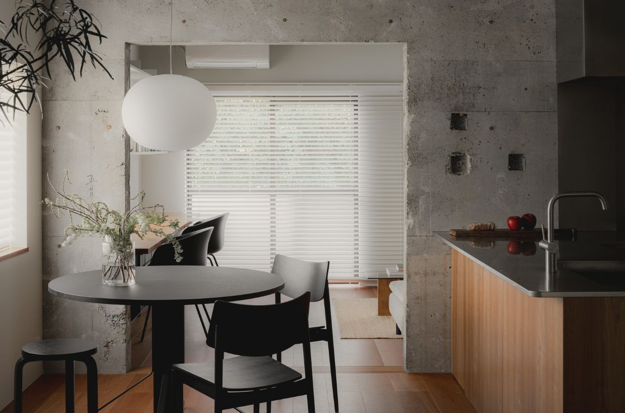 由於公共空間未做天花板,故以吊燈為主要照明來源,並局部輔佐燈條。戶外庭院的植栽維繫了隱私性之餘,也替室內引入了綠意。
