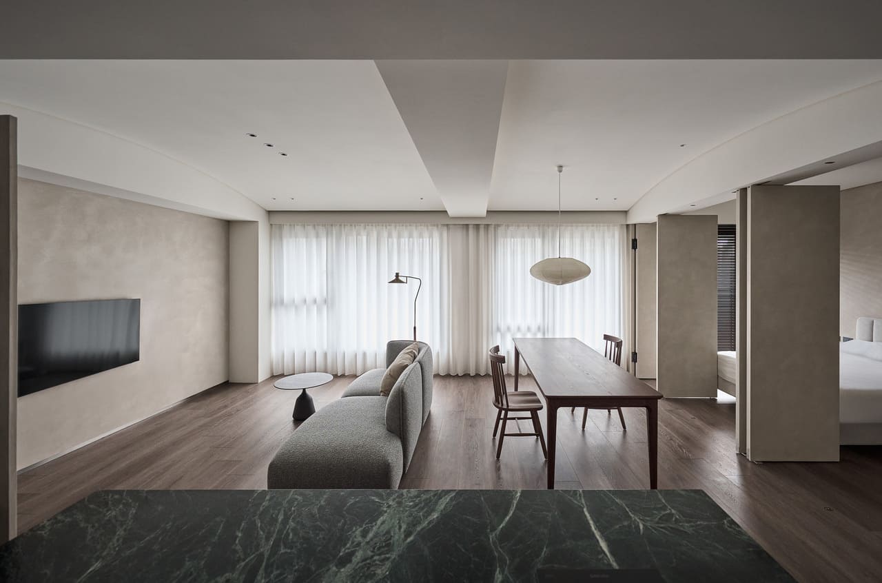 整體主要採用純粹材質,從木材的暖調及石材的冷調中構築和諧視景,簡約中帶有豐富質感細節。