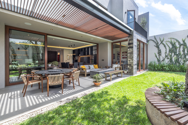 步入公共區域,開放式格局將客廳、餐廳與半戶外露台串聯一體,形成流暢的生活動線。覆蓋露台的木製格柵,不僅是結構的點綴,更成為光影的濾鏡;隨著日晷偏移,光線透過格柵灑落,在地坪與立面投射出層次豐富的陰影變化,為靜謐空間注入動態意境。家具軟裝以簡潔線條與中性色調為主,注重舒適與功能的平衡,不著痕跡地引導屋主回歸內心平靜。夜間,間接照明輕柔點亮建築細節與材質肌理,在光影交錯中呈現低調而充滿情感的空間視野。