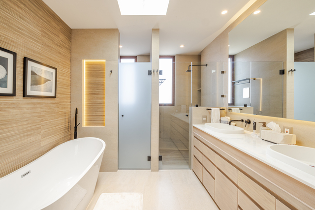 主浴採極簡設計,透過間接光源與天然材質,完美結合實用與美學。石材與木質的對話,圍塑令人放鬆的療癒時光。