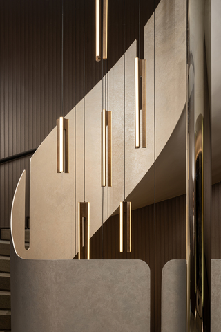 梯廳作為動線必經之處,以石材跟金屬框構出「方盒子」般的輕奢結構,牆面與地坪藉由幾何塊體堆疊,並以光源作為情緒導引,行走其間彷彿進入城市中的序曲通道,精準呈現立體而沉穩的設計細節。