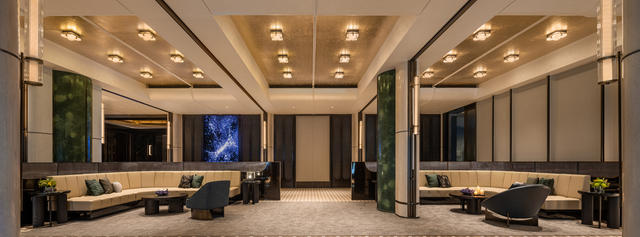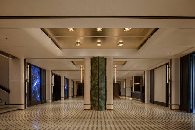身為體驗起點,大廳是匯聚多種功能於一身的公共空間,在本案中更需連結宴會接待中心和開放式點餐區的機能,設計團隊利用層層遞進的語彙,形塑出立體、有節奏的視覺脈絡;金色金屬和淺色石材交織,宛如城市律動的交響曲,生動悅耳。