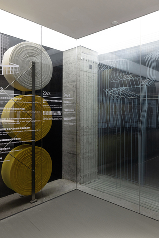 展廳敘事自入口左側的「卷布牆」展開。48個源自生產線意象的布卷,與工業展架形成序列長廊,宛如一條織物之河。而玻璃上的時光軸壁畫,以輕快筆觸勾勒品牌歷程。盡頭的基礎縫紉插畫,則悄然引領訪客深入空間。原有建築的承重柱,經半透玻璃修飾弱化,若隱若現地透出結構根基,並結合標誌自然引導動線。