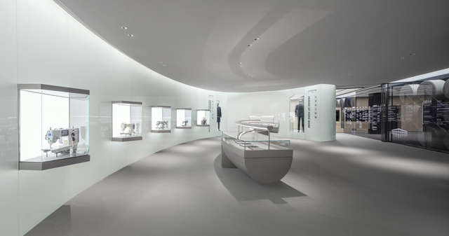 主入口正面的「品牌歷史區」,以弧形玻璃櫥窗替代實牆,依時間脈絡展示四個關鍵發展階段。故事從一件紅幫傳人陸成法大師的黑色大衣開始,牆面故事盒內陳列各時期縫紉機,與對應成衣形成對話。特別設置的工藝展台,陳列著熨斗、剪刀、量尺、手繪草圖板等老件工具,封存著製衣技藝的溫暖記憶與手作厚度,輕柔述說品牌恪守的工匠精神。