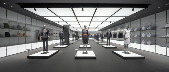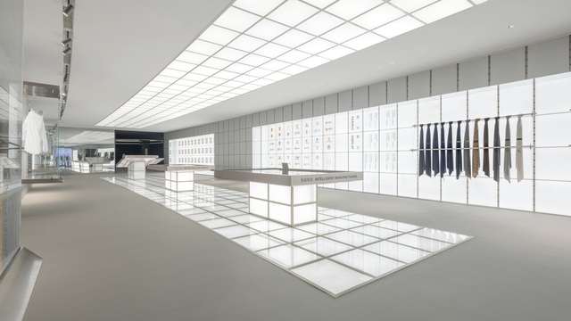 兩側牆面繼續沿用可變的模組化系統,透過金屬層板、拉索等多元配件,滿足從成套西裝、襯衫到領帶、徽章等不同規格產品的展示需求。「西裝陳列區」則利用垂降拉索懸掛服飾,在秩序中增添輕盈感,形塑趣味視覺。地坪鋪設灰色編織地毯,將整體視覺融為一體,創造靜謐而專注的氛圍場景。