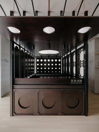 懸挑的圓形吊燈一如崑曲頭面垂墜的珍珠裝飾,經深色木板材的修飾,避免光線過分刺目。