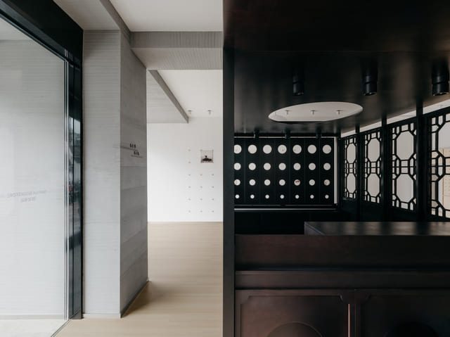 堂名擔內部安裝的燈具塗黑,與四周的深色板材相融,因應使用需求和時間變化,點亮室內每個需要照明的角落。