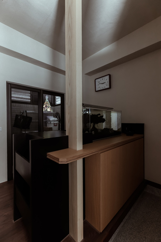 步入室內,首先迎來的是帶有高低差的日式玄關。此處不僅整合鞋櫃機能,更布置一座平台,提供屋主擺置水草缸,並考量水草特性不設主燈,予其穩定的生長環境。
