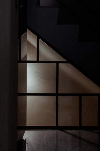 三樓梯間運用壓花玻璃拼接,篩入溫柔光線,柔化原有陰暗,為轉角勾勒出一抹明亮暖意。