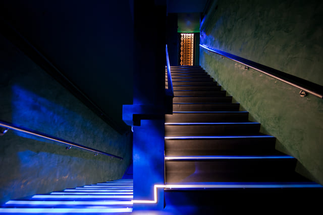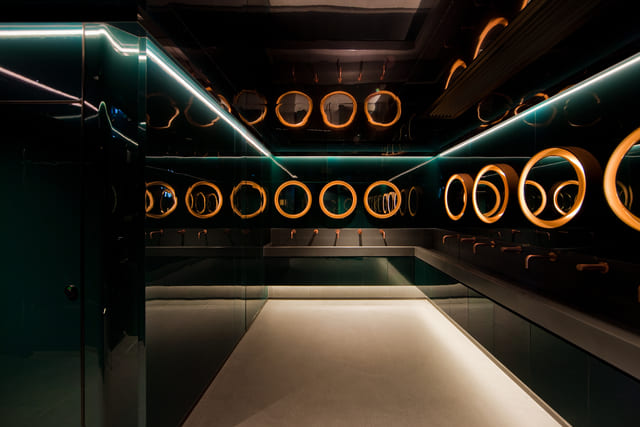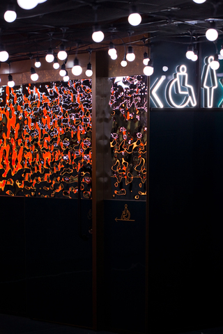 結合水下世界的想像和場景氛圍,設計著重燈光與色調運用,每個細節均旨在引導賓客沉浸於空間敘事,即便次要空間如洗手間,同樣延續場館整體一致的戲劇化用色和材料風格,創造獨特的氛圍體驗。富有高光澤的牆面處理與拋光鋼質配件相結合,結合引人聯想到都會深夜繽紛的霓虹燈光,呈現空靈而沉浸的環境視覺。