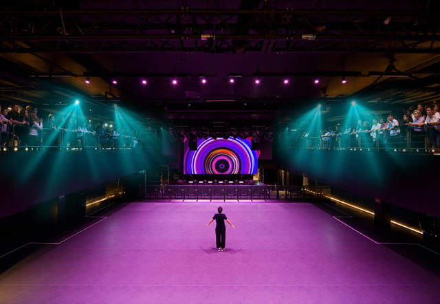舞台周邊的觀眾席安置於夾層,不僅為下方的表演者預留更加寬廣的移動空間,也便於觀眾將表演完整納入視野。