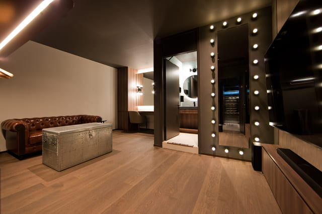 表演者的休憩室提供社交、化妝和整理衣飾等等功能,除了基礎沐浴設施,還有沙發和設計為藏寶箱外型的小桌几,因應多元需求。