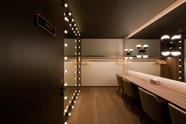 更衣間採用大幅木質平面,在上台前的短暫時光和緊繃情緒間,給予使用者安定心神的親膚感受。