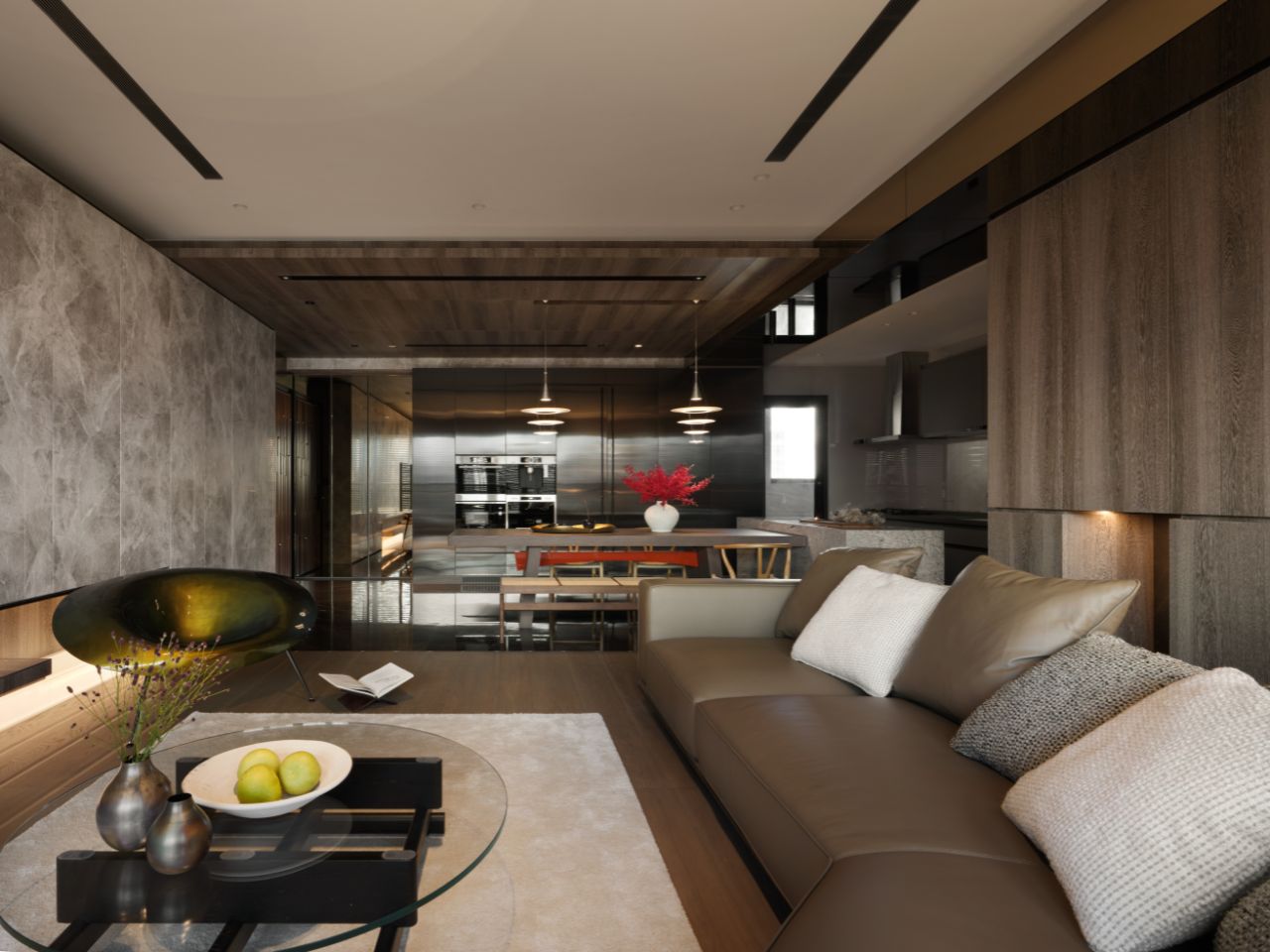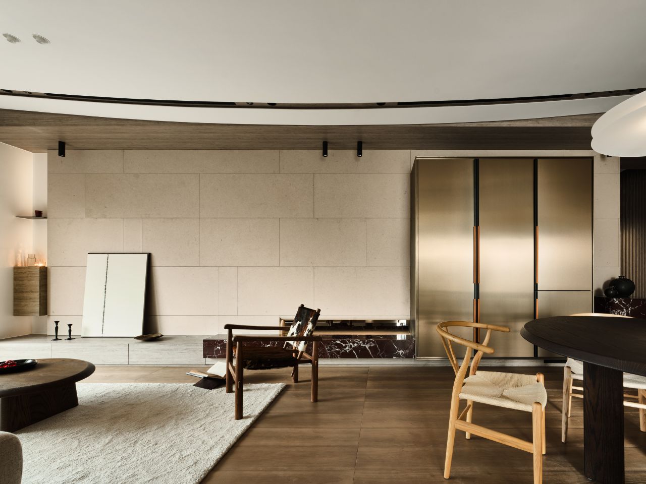 沙發背牆布置開放式木質展櫃,佐以低調的灰色實牆,在虛實交錯間,共構溫潤而沉靜的居家氛圍。