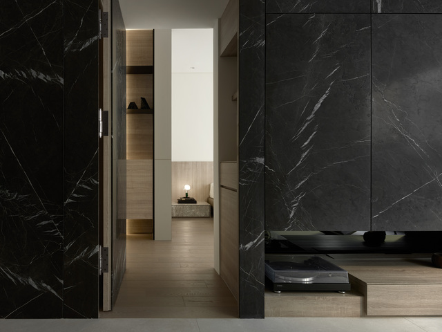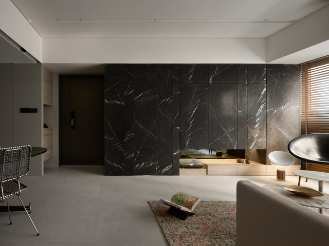 以局部包樑與半高電視牆柔化沉重視覺,並鋪上松柏石整合隱形門、電視牆、收納等機能,形塑沉著高雅的日常視野。