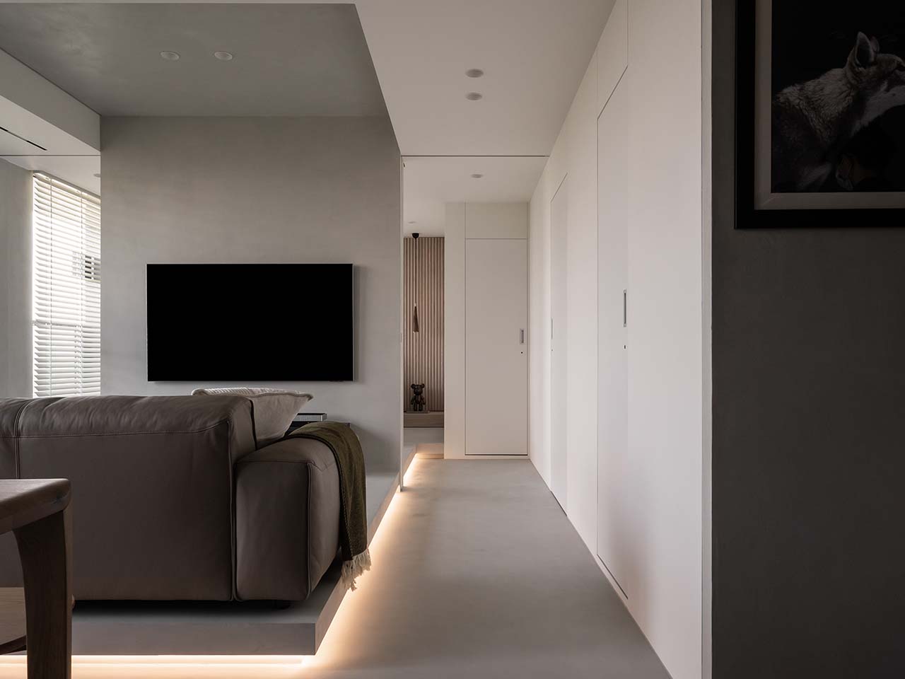 左側設置一面鏡牆,同時在後方藏匿配電箱,讓空間有了視覺延伸的錯覺。設計師提及,這面鏡子就如家中的穿衣鏡,讓完成護膚療程的客人,能夠即刻看見煥然一新的自己,彷彿回到最放鬆的家中,連離去,也成為一種溫柔儀式。