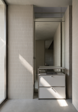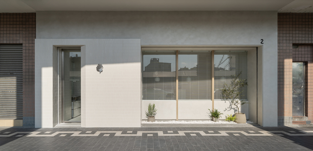 從立面延伸至室內玄關的立面,鋪上白色馬賽克磁磚,形成連續而淨朗的視覺語言。特別的是,門面右上角,一枚「2」字的金屬門牌,由設計團隊親手換上,低調地與立面融為一體,顯得乾淨雅致。
