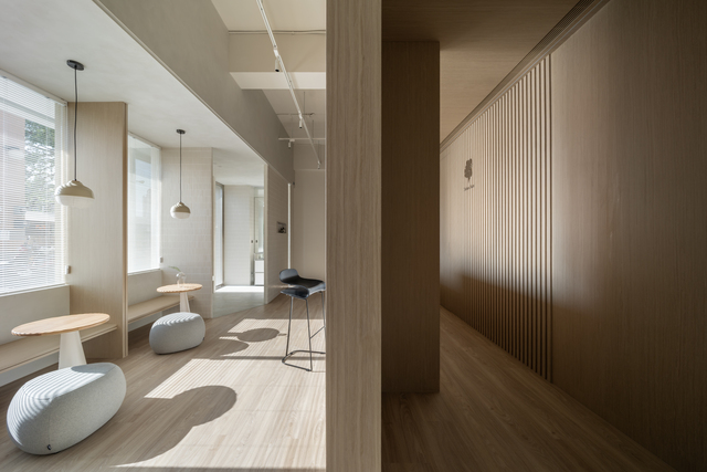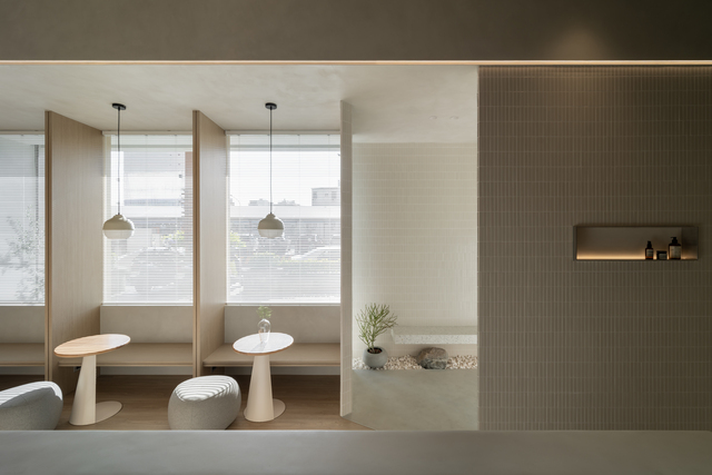 窗畔三席兼具等待與諮詢機能,如咖啡座般悠閒,佐以圓潤桌椅與簡練木作相映,為空間添了幾分柔和。