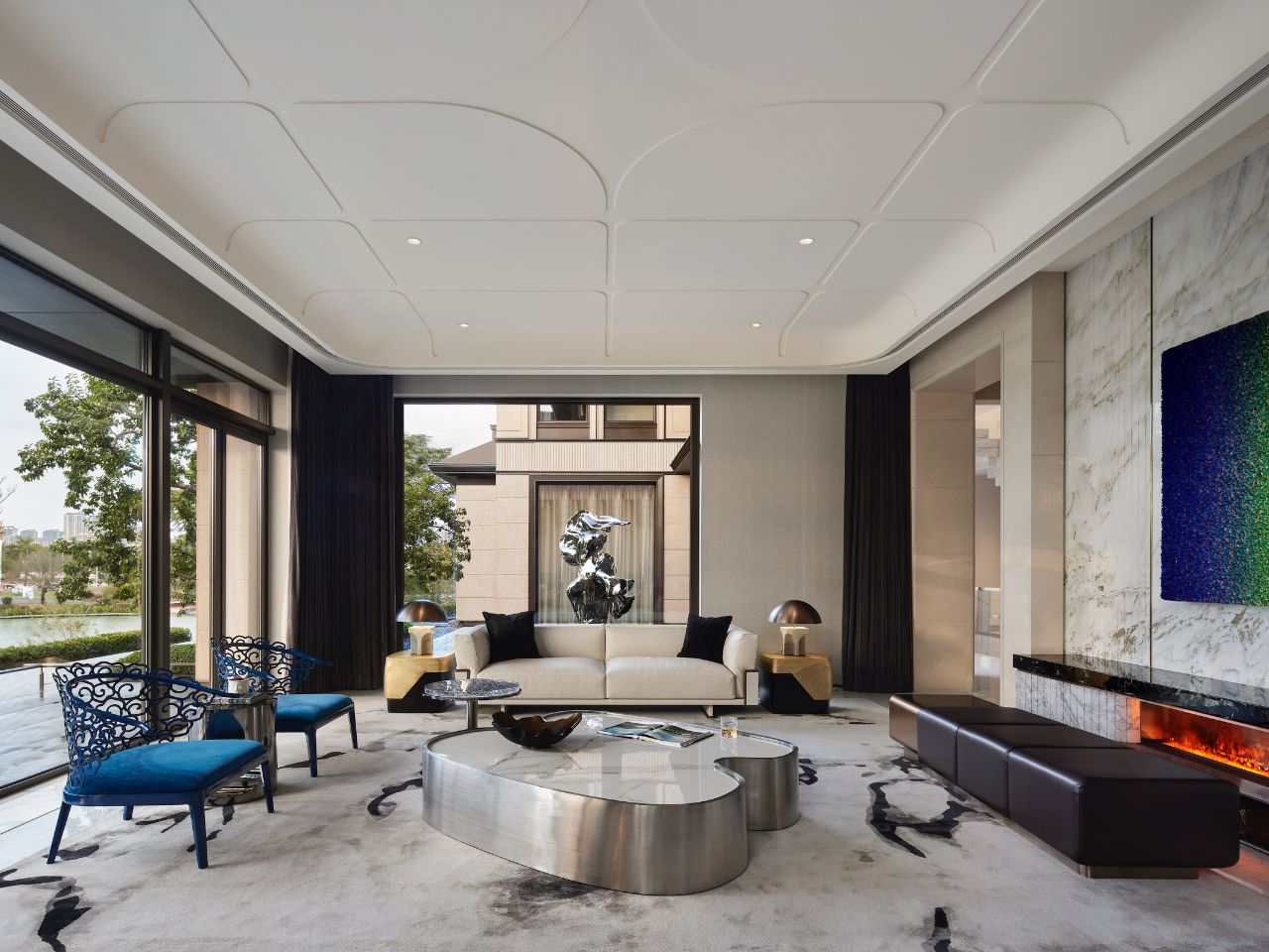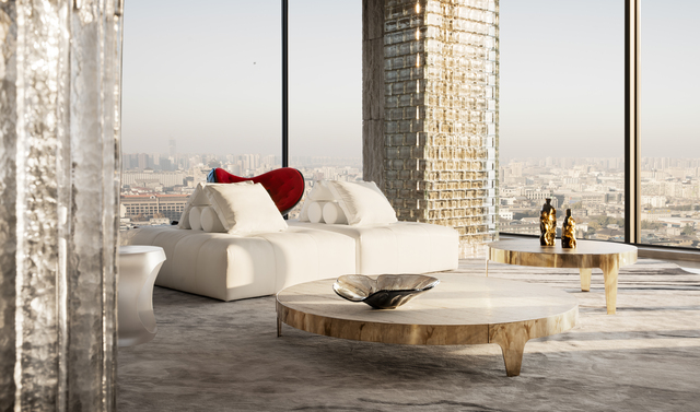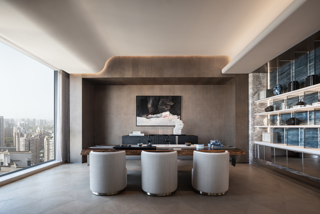 天花以流動曲線在空間中延展,象徵山勢與地形的起伏,而位於正上方的大樑結構,則經由3D模型反覆推演與精準施工,最終消融於天花流線之中。在客廳之隅,擺放著名為《守衛者》的藝術裝置,有著向古城牆致意的寓意,靠窗處則懸掛著藝術裝置《山語》,其以數位手法重構山的形態,將秦嶺的自然意象帶入室內。