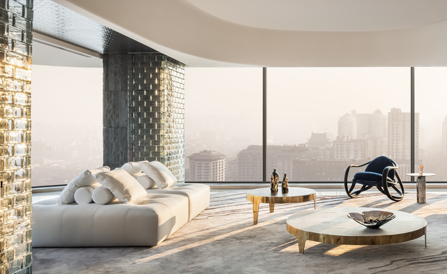 西安是座被歷史與自然共同塑造的城市,一側是古城牆的記憶,另一側是秦嶺山系的意象。設計團隊將這種「城市與山河」的關係,轉化為室內設計語言。步入客廳,窗邊的落地窗,將永寧門與城牆景致盡收眼底。