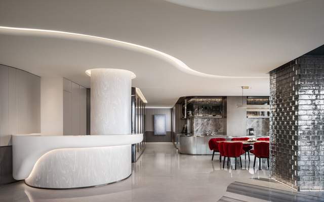 光線在空間中流動,白日,自然光透過玻璃磚牆與落地窗,在室內投下柔和光影。入夜後,人造光源則細膩勾勒天花曲線,烘托藝術品質感,營造安靜而富有張力的氛圍,此外,玻璃磚與石皮的工藝,結合燈光,更是清晰地傳達設計底蘊。