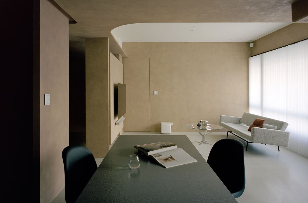 「家」,不只屬於居住其中的人,也屬於以另一種尺度理解空間的生命。十穎設計新作《烏諾的完美日常》是一對夫妻與兩隻寵物共同生活的家宅,團隊在規劃之初便意識到,除了滿足人類需求外,空間也將成為貓咪「烏諾」和狗狗「Bibo」的活動場域──牠們會在屋內尋找自己的路徑,穿梭、停留,感受光影和溫暖陪伴。於是,設計遂在節制之中留下更多探索可能。 《烏諾的完美日常》居住者為一對夫妻以及兩隻貓狗,設計師藉由重塑格局於動線,打造適合人寵共居的環境。 以需求為起點的布局 本作為一處屋況良好的中古屋,整體結構條件單純。居者需求相對明確,保留兩間衛浴、打造完善的料理區域,以及妥善安排寵物的活動空間。由於家中狗狗性格較為活潑,容易追逐貓咪,因此特別將其中一個房間布局為貓咪專屬,使兩隻動物擁有安定的生活領域;格局調整幅度不大,主要藉由細緻的動線安排,使人寵之間獲得適切的平衡。 玄關和廚房之間利用一道縫隙讓光線、空氣等能自然流動。 入口處設置玄關落塵區,整合鞋櫃和電器收納,形成一道過渡介面,在進入公區之前保有適度的緩衝。然而,大量收納櫃體也在一定程度上遮蔽了採光的漫射,為此,設計團隊在玄關及廚房交界的轉折處刻意開出一道細縫,使光線、空氣、氣味和聲音得以穿透其中,強化人對環境的知覺。有趣的是,這道縫隙也成為貓狗的秘密途徑,讓牠們自由穿行往返,以自己的角度感知空間。 這道縫隙也變成家中貓狗的探索路徑,以牠們自身的尺度理解空間。 曲線與沙漠色的交織 業主偏好柔和的曲線,設計師將弧形元素局部運用於公共區域與客浴等處,使原本以直線構成的畫面多了一層柔軟意象。這樣的曲面操作部分靈感來自設計師於丹麥參訪由日本建築師隈研吾設計的「安徒生博物館H.C. Andersen's House」,當中乾淨而克制的線條成為此次空間語彙的啟發,弧形牆體不僅柔化邊界,也讓動線在轉折之間自然延展。 利用鐵件和柱體形成L型支撐,使量體更為輕盈,保有呼吸的餘裕。 以弧形天花弱化直角邊界,形塑簡潔而沉靜的客廳場景。 針對材質與色彩搭配,業主喜愛極為平整、純粹的質感,有鑑於此,立面多採用無縫微水泥塗料,營造一致而細膩的表面肌理。色彩以「沙漠色」為主軸,輔以深沉的黑灰低彩度色系,當採光落在牆面時,特殊塗料會呈現微妙的光澤變化,使看似單純的色調蘊含豐富層次;暖灰地坪則在沉穩中保有溫度。本案亦與陶藝家李荔合作,色彩刻意與陶土質地相互映襯,使藝術燈飾能自然融入場域,化為日常的一部分。 室內以沙漠色為主調,搭配黑灰色系定下內斂濃厚的個性。 光影與量體之間 基地位於三樓,客廳窗外正好可望見樹梢景觀,因此窗面以可隨意調整角度的直立柔紗簾,形塑自然光的光影變化。室內則盡可能減少天花板配置,將層高最大化,管線整合與收納規劃躍為設計關鍵,電視牆利用鐵件及柱體形成L型支撐,賦予塊體懸浮感,削弱結構的厚重。 盡量保持天花板的乾淨俐落,並於隔間做好結構補強,藉此滿足日後格局的可變性。 弧形牆體的延伸感讓視覺順勢流動,空間轉折也更加柔和。 夫妻二人皆熱愛料理,廚房和中島便成為家宅核心,除了廚房安設爐具外,中島亦設置IH爐,使料理行為能更自由地展開。中島桌面特別加長,形成兼具料理和用餐功能的平台;設計上以深色調突顯量體存在性,並運用鏡面與灰色玻璃材質構築,在視覺上更顯輕盈,自然凝聚料理與交流的生活場景。 中島可謂全案的核心,特意將桌面加長以增設IH爐,桌腳則利用鏡面與灰玻打造,具反射性之餘也弱化量體感。 中島可謂全案的核心,特意將桌面加長以增設IH爐,桌腳則利用鏡面與灰玻打造,具反射性之餘也弱化量體感。 靜謐中延展日常 通往客浴和貓房的過道,設計師刻意將尺度收斂,塑造略帶隧道感的氛圍,當人沿著走道前行,視線會自然被引導至端景處,業主挑選的深藍色面盆上,這抹色彩增添了空間沉靜而深邃的表情。浴室內部塗鋪黑色防水樂土,延續低彩度策略,而弧形牆體則強化了流動感,化為富有節奏的空間片段。 通往客廁和貓房的過道以深藍色面盆為端景,增添一抹深邃色彩。 客浴以防水黑色樂土為材,細膩而連續的表面肌理更顯沉靜。 沙漠色牆面和黑灰色細節層層疊加,空間最終形成一種安靜而穩定的氣氛。在這樣的環境中,人與寵物各自找到喜歡的角落或行走路徑,光影緩慢移動,時間也靜靜流動,這或許正是《烏諾的完美日常》所描繪的日常樣貌:在陪伴與探索之間,度過悠長而美好的日子。 窗邊柔紗簾篩落自然光,沙漠色牆面在漫射光影中展現溫潤質感。 臥室透過櫃體與樑柱形成包覆構成,消解結構壓迫。 主臥衛浴一隅。 採訪」陳映蓁