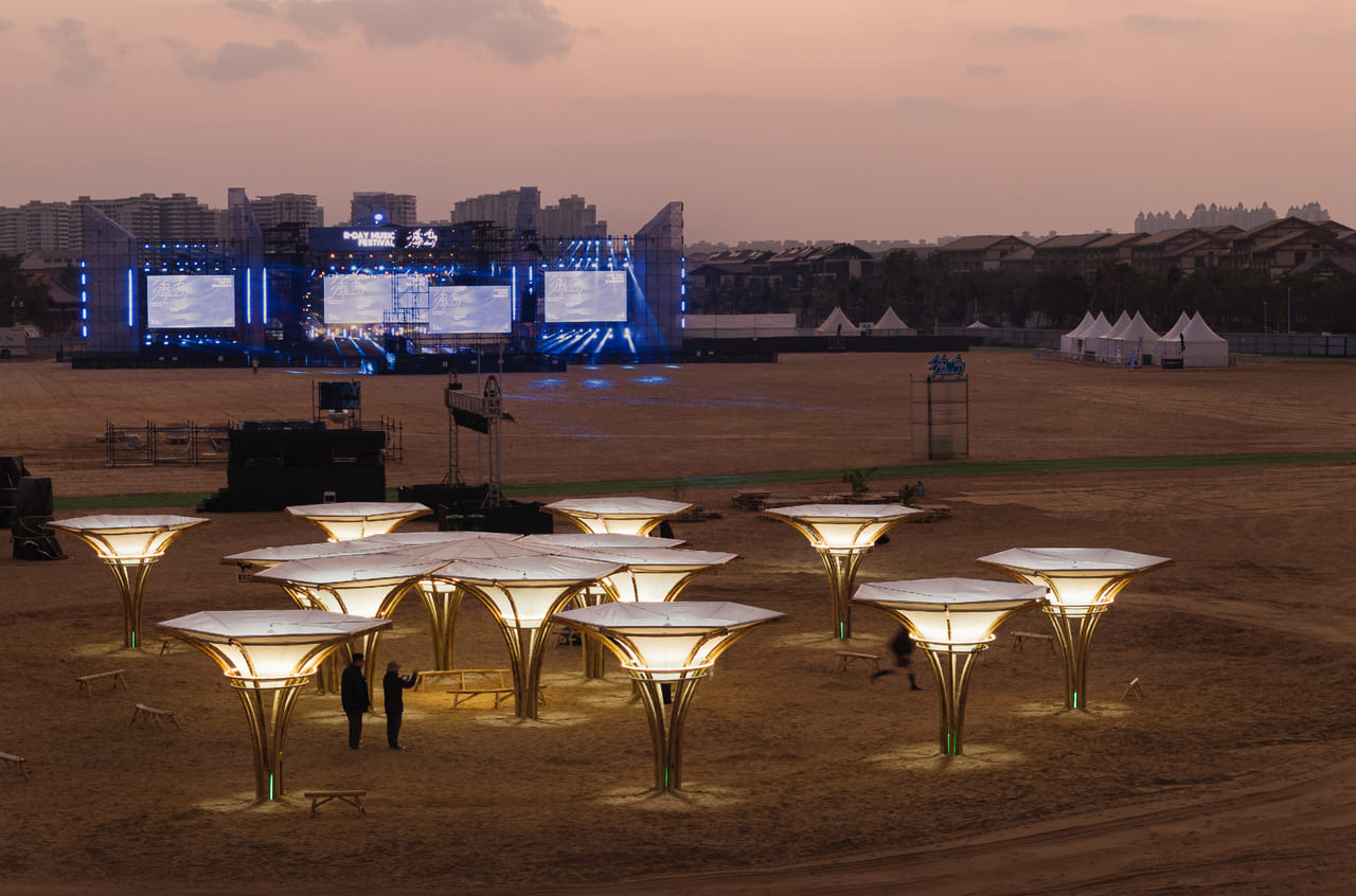 結合地形高低差,透過樓梯安排下沉景觀,環繞樓梯的巨型穹頂式環形螢幕,豐富通行路徑的樂趣。