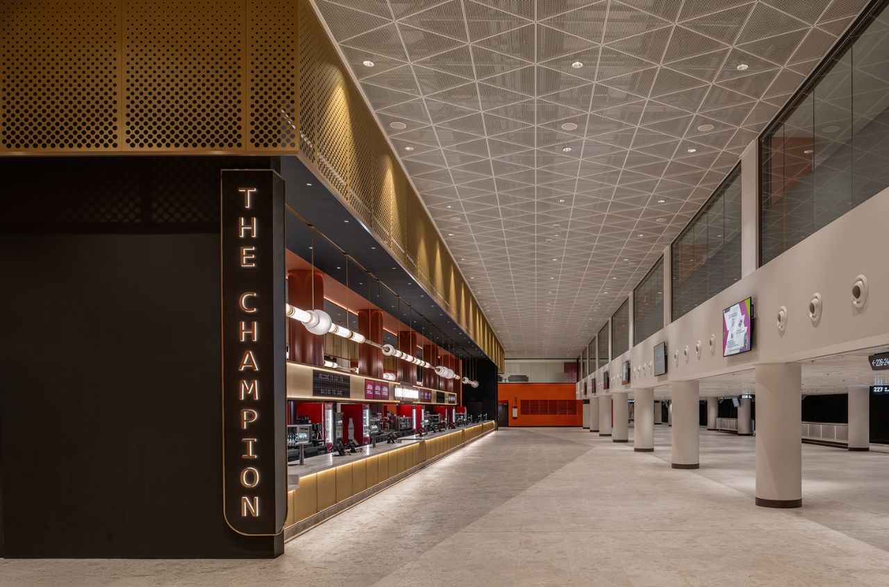 大堂揚棄冗餘的裝飾性元素,利用空間架構表現雕塑般的震撼視覺,裸露的屋頂搭起宛如山脈般的形象,更通過其富有韻律的結構線條,強化場所精神,室內空間戲劇性的起伏與外部的自然景觀形成和諧奇妙的對照。兩側天花挑高夾道,效法層巒疊嶂的山體輪廓,配合頂部天窗陣列投下自然光,錯落疊映的天花縫隙和異材拼接,篩落層次豐富的光影肌理,宛如在山林漫步時,穿透樹梢和林蔭的細碎陽光。