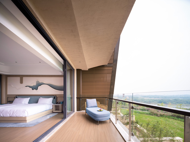 圓形草坪作為室外活動區域,寬闊的空間富有多樣可能性,可舉辦派對或搭建休閒帳篷,與全通透玻璃幕牆的多功能廳形成可自由切換的使用彈性。350間客房均設陽台,邀請窗外的山景入室,寢區背景牆以「流雲」為主題意象,淺竹青與水墨線條交織,在坐臥起居的細節中感受自然的詩意。