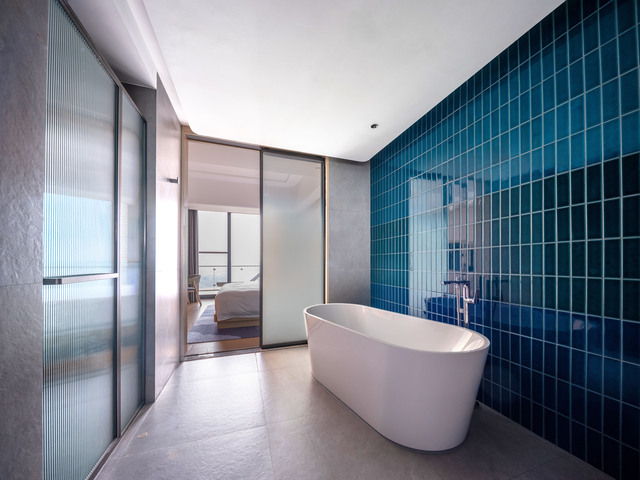 衛浴間採用長虹玻璃作為隔板,平衡採光和使用隱私,在整體簡潔的設色背景中,白瓷浴缸和石紋地板的質感豐富了空間層次。