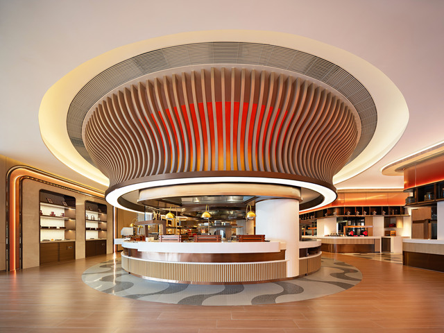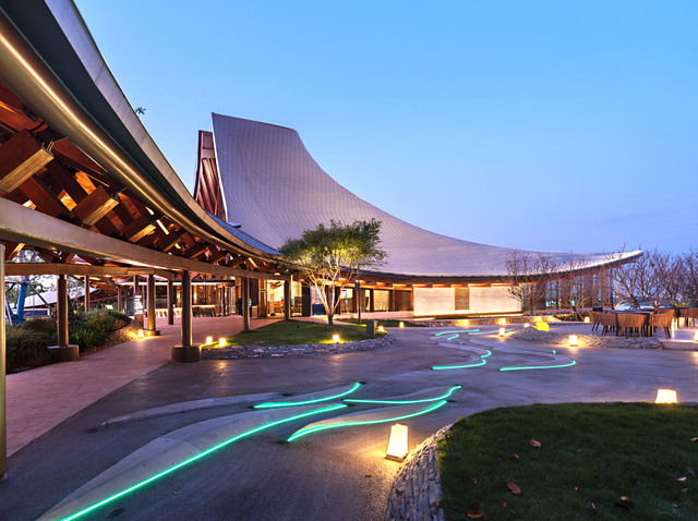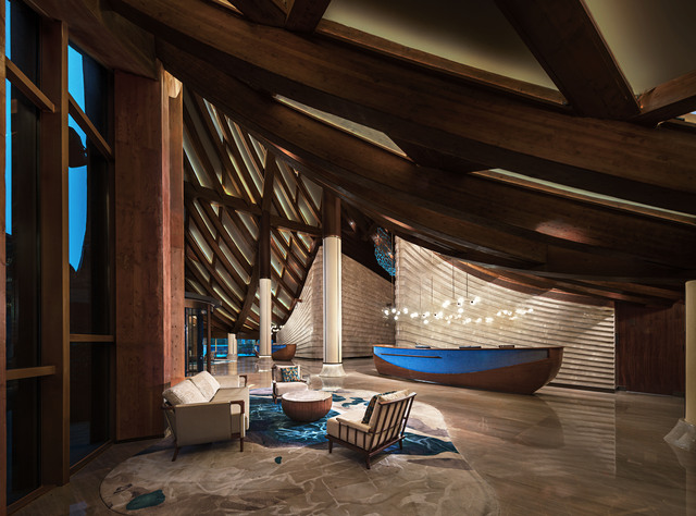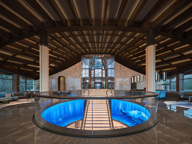 前台設計如一葉扁舟,引人意會到度假村即是一處迎接無數船舟停泊於此方水域的寧靜港灣,跟隨大堂樓梯的引導,螺旋下沉的環形動線串連其他功能區域,環繞巨型穹頂螢幕以數位影像構建的海底世界,人群匯聚於此、川流不息,深入空間內部的過程既如步步走向地心、又似是探索地下深海。經過山水的滋養,生命得以破土而出,全日餐廳因而化為山林的姿態呈現,通過木質鋪陳,以及宛如樹木枝枒的立柱、天花結構,賦予空間野生的呼吸感,與窗外的樹頂相映成趣,也讓用餐的來賓化為森林生態的一份子。