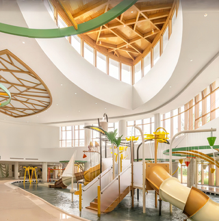 流水意象如同無形筆觸,既串連起室內外的場景互動,同時又因應不同環境條件形塑不同場域樣貌,室外無邊泳池以台地式布局鋪展,鏡面水體與天際線相接,承襲天空的無邊壯闊;室內恆溫水樂園內含巨型葉脈天花、植物造型噴水裝置與滑梯,建構宛如童話世界般的雨林景觀。水療靜池則藏身於「水岸竹隱」之中,取用巴蜀竹林意象,在竹影婆娑間融入天然屏障,為放鬆身心的環境維護使用隱私。