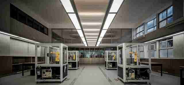 設計理念源於對職人工藝精神的尊重與重現,僅以數控技術獨立完成的入口雕塑裝置,傳遞數位加工技藝的藝術精神,將原車洗床教室轉型為自動化數控教室,兼具考場功能。中軸對稱的燈架將天花一分為二,行走於如運輸帶的光廊下,空中漂浮燈架劃分領域,也兼顧照明;手臂作業區上方挑空,引入大量自然光,側邊廊道化身藝廊,提升學生作品藝術價值。設計整合多元機能與抽象精神,讓空間精神帶動學生心靈,提升學子為所學技藝的自豪感與對未來創作的想像力。