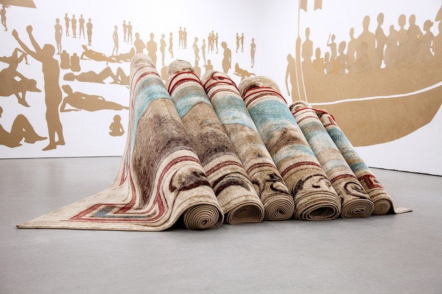 赫拉・比于塔詹,《摧毀你家,造一艘船,拯救生命》,2015。地毯印刷,尺寸依空間而定。圖像由藝術家及Green Art Gallery Dubai and EVA International–Ireland's Biennial提供。攝影:Miriam O' Connor。
