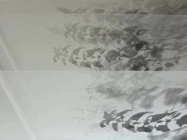 法特瑪・阿布杜哈迪,《留下的⋯⋯盡可能長存》,2025。絹印於透明網布、不鏽鋼懸吊結構、九層塔植栽,共18幅,每幅400 x 90公分。